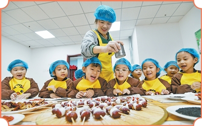 山东省乐陵市天和嘉园幼儿园,小朋友在老师帮助下体验面食制作。 |