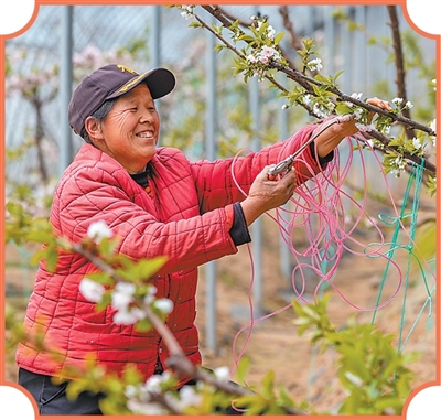 山西省运城市平陆县的现代农业采摘园内,果农对樱桃树进行授粉作业。 |