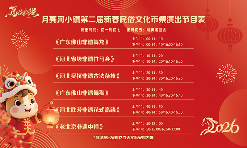 年戏·戏台下的七日连台: 从大年初一到初七,小镇的公共空间将上演连台好戏。主办方特邀北京、河北等地的非遗演出团队,带来舞龙、舞狮、高跷、中幡、竹马会、杂技等经典节目,所有演出均免费向市民游客开放,旨在唤醒大家记忆深处最醇厚的年节氛围。