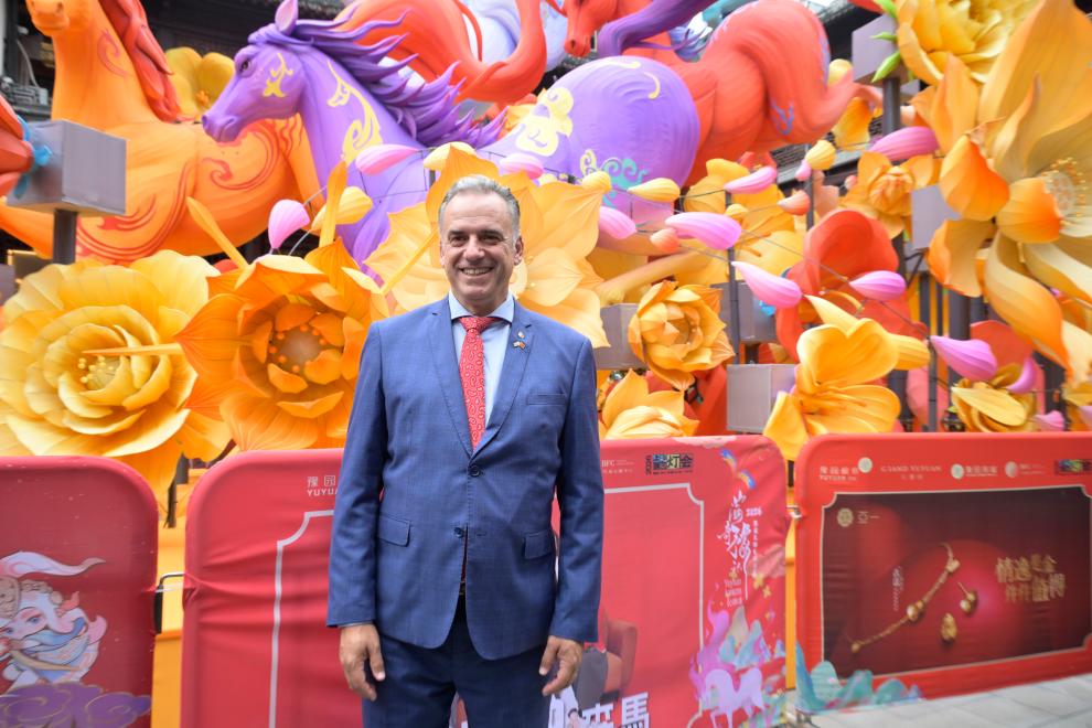 乌拉圭总统奥尔西2月5日在上海豫园迎接农历新年的奔马花灯前留影。新华社记者 高峰 摄