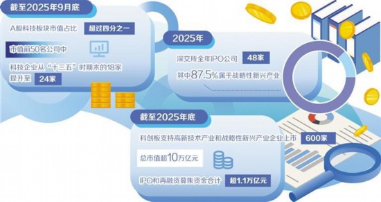 2025年,资本市场投融资两端改革效应不断放大,支持科技创新的资金、考核、工具和服务体系逐步健全。在融资端,监管部门持续深化发行上市、并购重组等领域改革,引导各类要素资源加快向科技创新领域集聚。截至2025年9月底,A股科技板块市值占比超过四分之一,已明显高于银行、非银金融、房地产行业市值合计占比。市值前50名公司中,科技企业从“十三五”时期末的18家提升至24家。