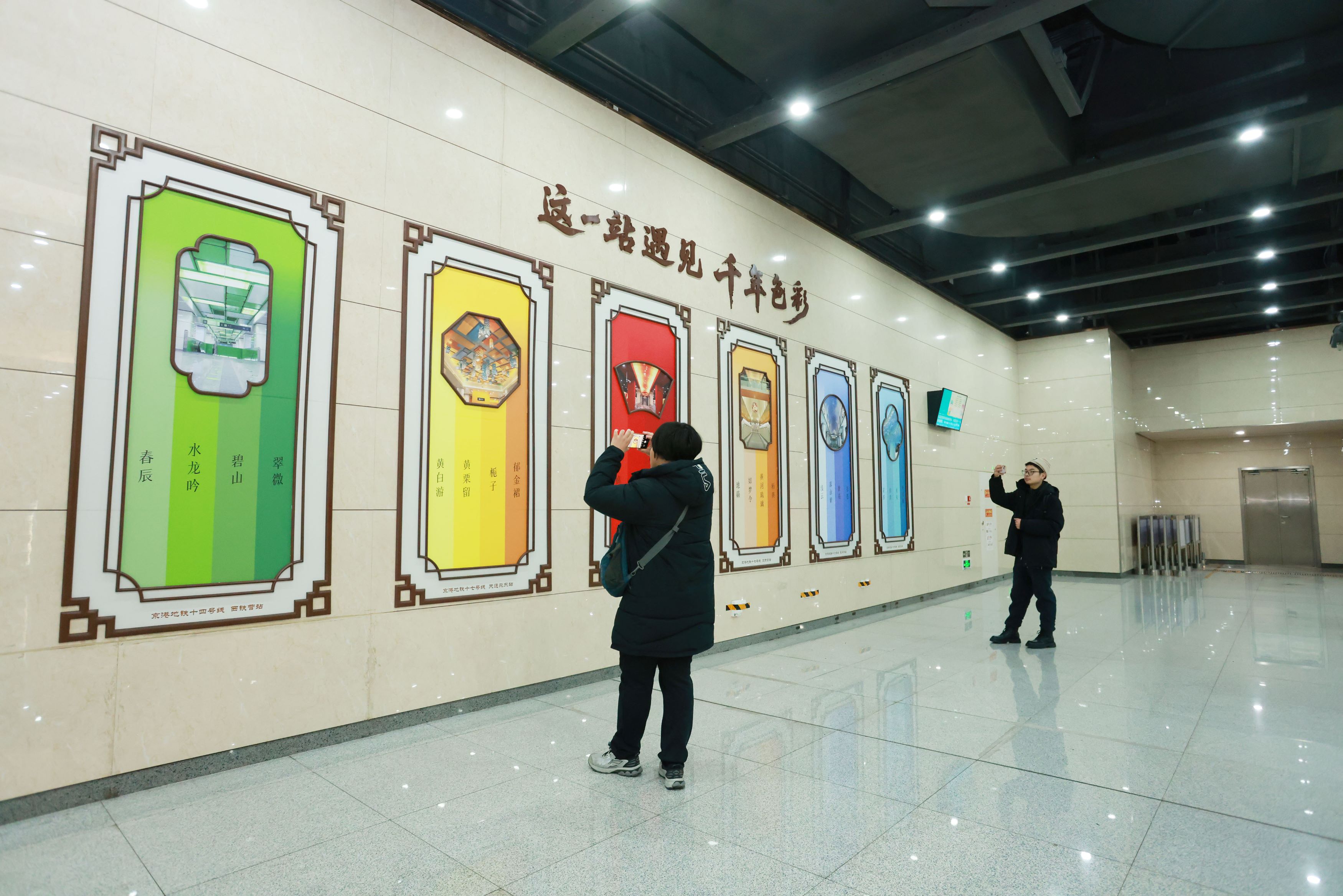 为提升观展体验,五大展区均设有感应式语音讲解装置,乘客只需用手机轻触,即可收听展品对应的解说。此外,站厅区域更以古典花窗元素进行装饰,巧妙展示地铁车站环境配色与传统色彩的关联,与色彩文化展区遥相呼应,共同营造出典雅的艺术氛围,让匆匆过往的乘客得以沉浸式感受色彩背后的历史故事。