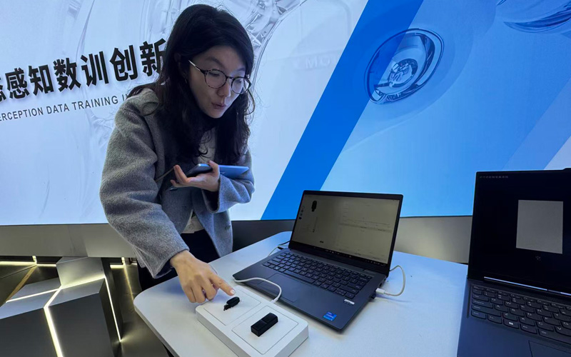 作为国家级专精特新重点“小巨人”企业,他山科技自主研发的AI触觉感知技术,为机器人装上了灵敏的“电子皮肤”。在一块演示设备上,记者看到,即便手指尚未触碰到传感器表面,传感器也能感应到微弱的压力变化并迅速响应。这项技术应用于机器人指尖,能使其精准感知抓取物品的力度,无论是采摘蓝莓这类易破水果,还是拆除软包装,都能游刃有余。这正是三期项目的核心——聚焦高精度触觉传感数据采集,填补了以往机器人在精细化操作维度上的空白。
