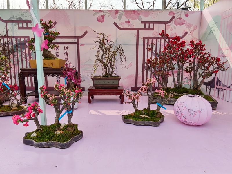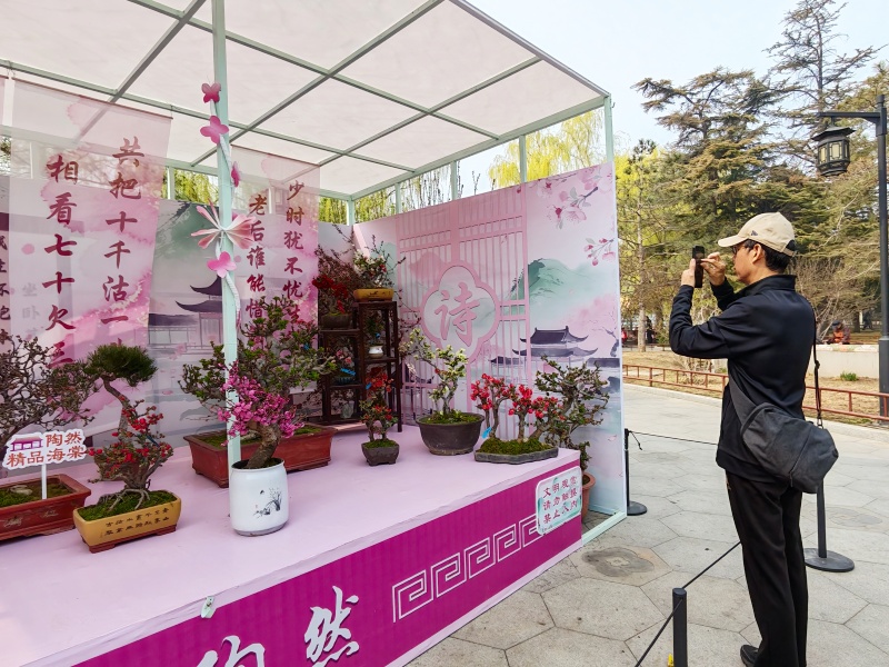 据了解,本届陶然亭海棠春花文化以“春悦陶然 棠香满园”为主题,全园共展出20余种500余盆海棠精品盆景,配合园内30余种3000余株地栽海棠,以海棠式花窗、中式影壁墙、风铃等诸多元素,通过框景等传统技法,依次沿东门内广场、东码头对面广场、陶然牌楼、中心广场,设置海棠映壁、花影摇曳、春醉陶然、精品盆景区4处景观节点,串联“陶然醉春风”精品赏花路线景观,并通过灯光艺术与自然景观节点的融合,打造“梦幻棠影 夜游陶然”主题夜间景观综合带,形成层次丰富、主题鲜明、一步一景的诗意氛围。中心广场设置“诗、酒、花、茶”4个主题展棚,展棚以博古架、艺术展架的形式展出500余盆精品海棠盆景,让游客近距离感受海棠盆景的精巧雅致。