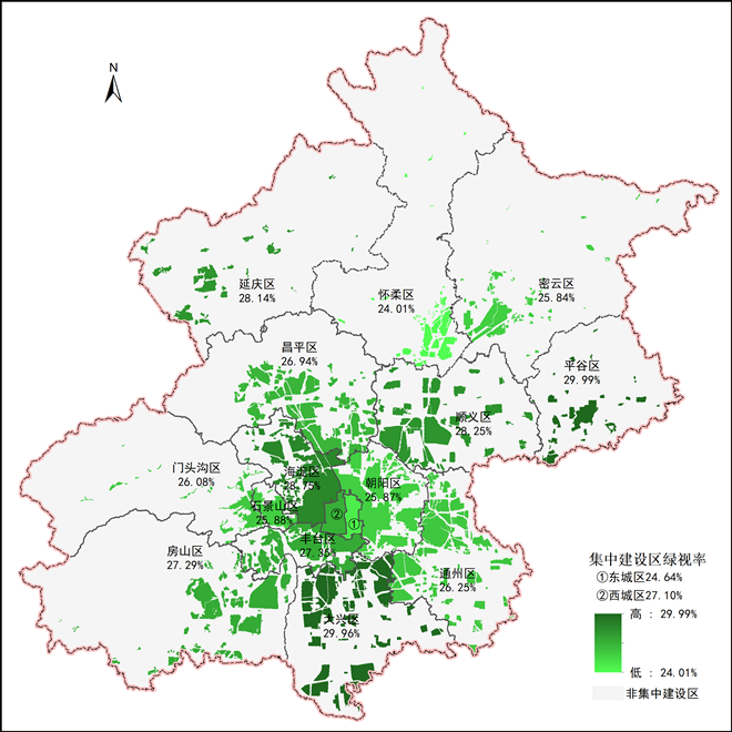 北京市集中建设区绿视率分布图。