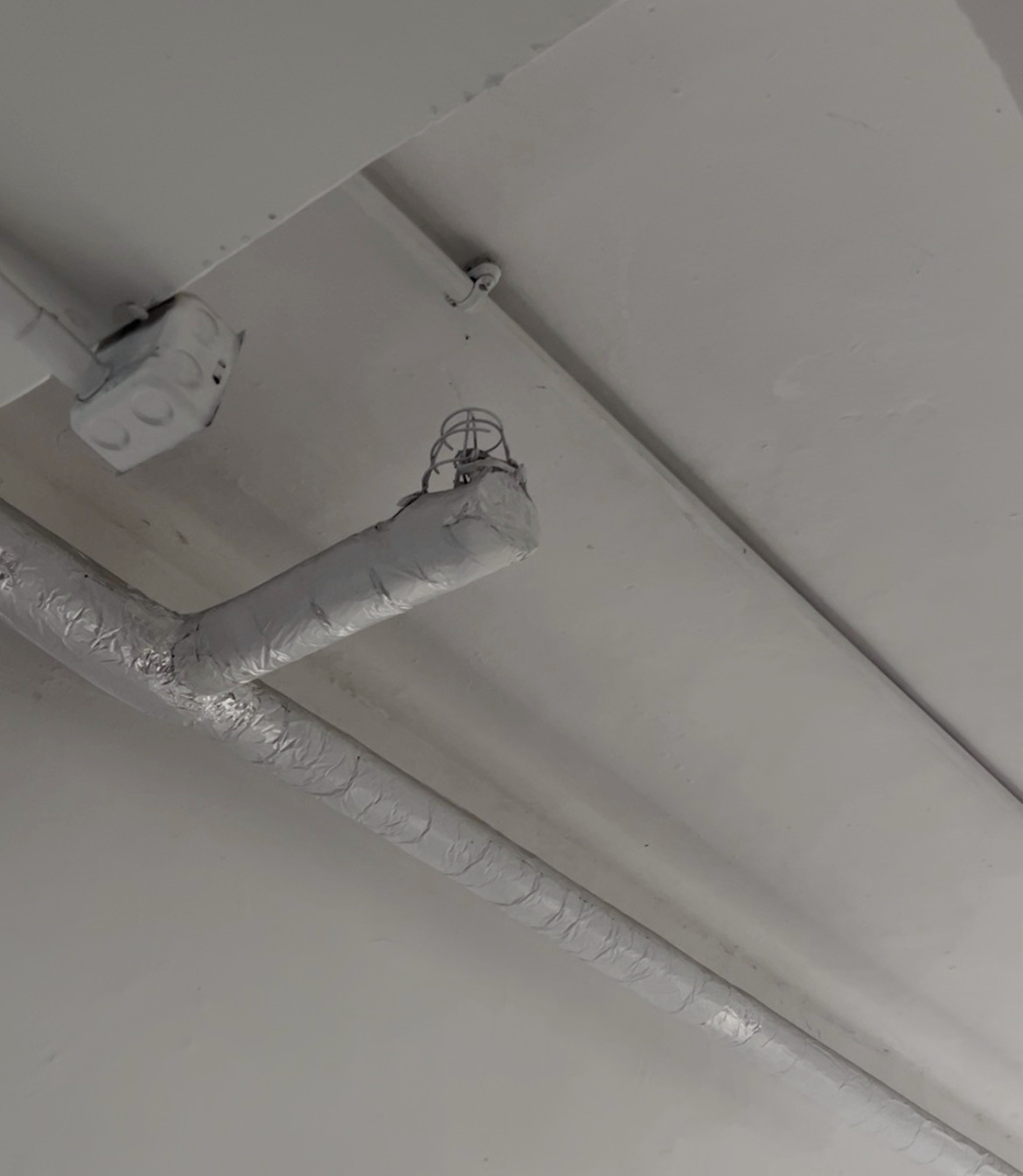 沿着水表井,管道从地面下钻出、沿着墙体,进入楼道,一路向上。密布的喷头就藏在屋顶上。“喷头是感知温度的,一旦温度达到68摄氏度以上,喷淋会自动爆破,实现喷水。”朱进步表示,这也给大家留出逃生通道,防患于未然。