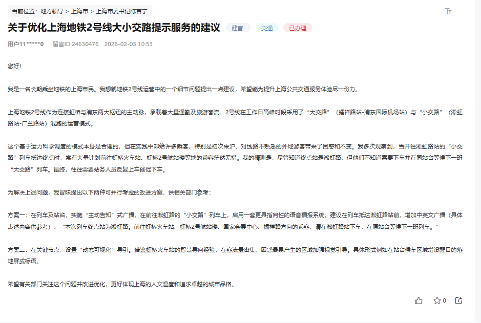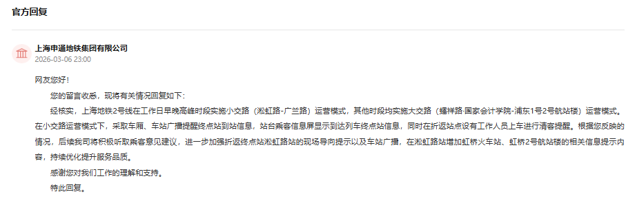 该网友提了两点建议,一是可在列车及站台,实施“主动告知”式广播,在前往淞虹路的“小交路”列车上,启用一套更具指向性的语音播报系统,并在列车抵达淞虹路站前,增加中英文广播。二是在关键节点,设置“动态可视化”导引,借鉴虹桥火车站的智慧导向经验,在客流最密集、困惑最易产生的区域加强视觉引导。