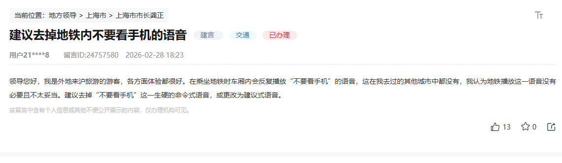 近日,有上海网友在人民网“领导留言板”上留言表示,在乘坐地铁时,车厢内会反复播放“不要看手机”的语音,认为此语音播报没有必要且不太妥当,该网友建议去掉这一生硬的命令式语音,或改为建议式语音。