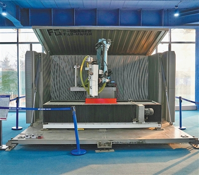 河北“雄安之翼”主楼一层的“胶囊工厂”内,3D打印机在打印外墙板材。