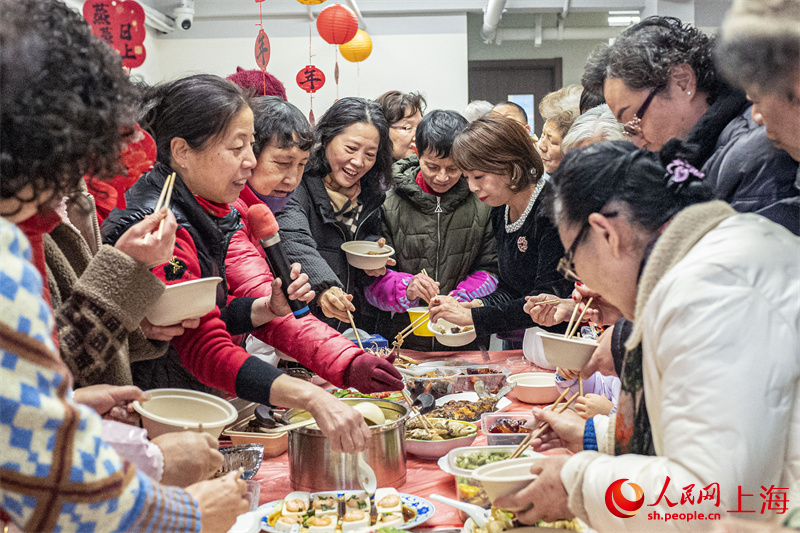 “让一让,‘招财进宝’来喽。”69岁的万月圆老人端着热气腾腾的拿手菜,笑盈盈地走进了小区居委会大会议室。长桌上早已摆满了四喜烤麸、油爆虾、全家福等各家各户带来的特色菜肴,香气交织,暖意融融。