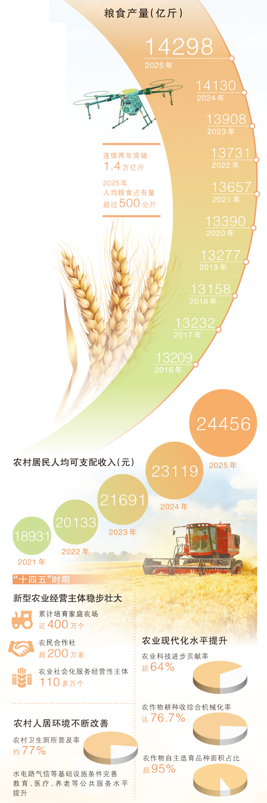 2025年,我国粮食生产克服多重不利天气影响,产量再创历史新高,连续两年稳定在1.4万亿斤以上。