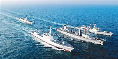 图为舰艇编队在航行补给训练中。 |