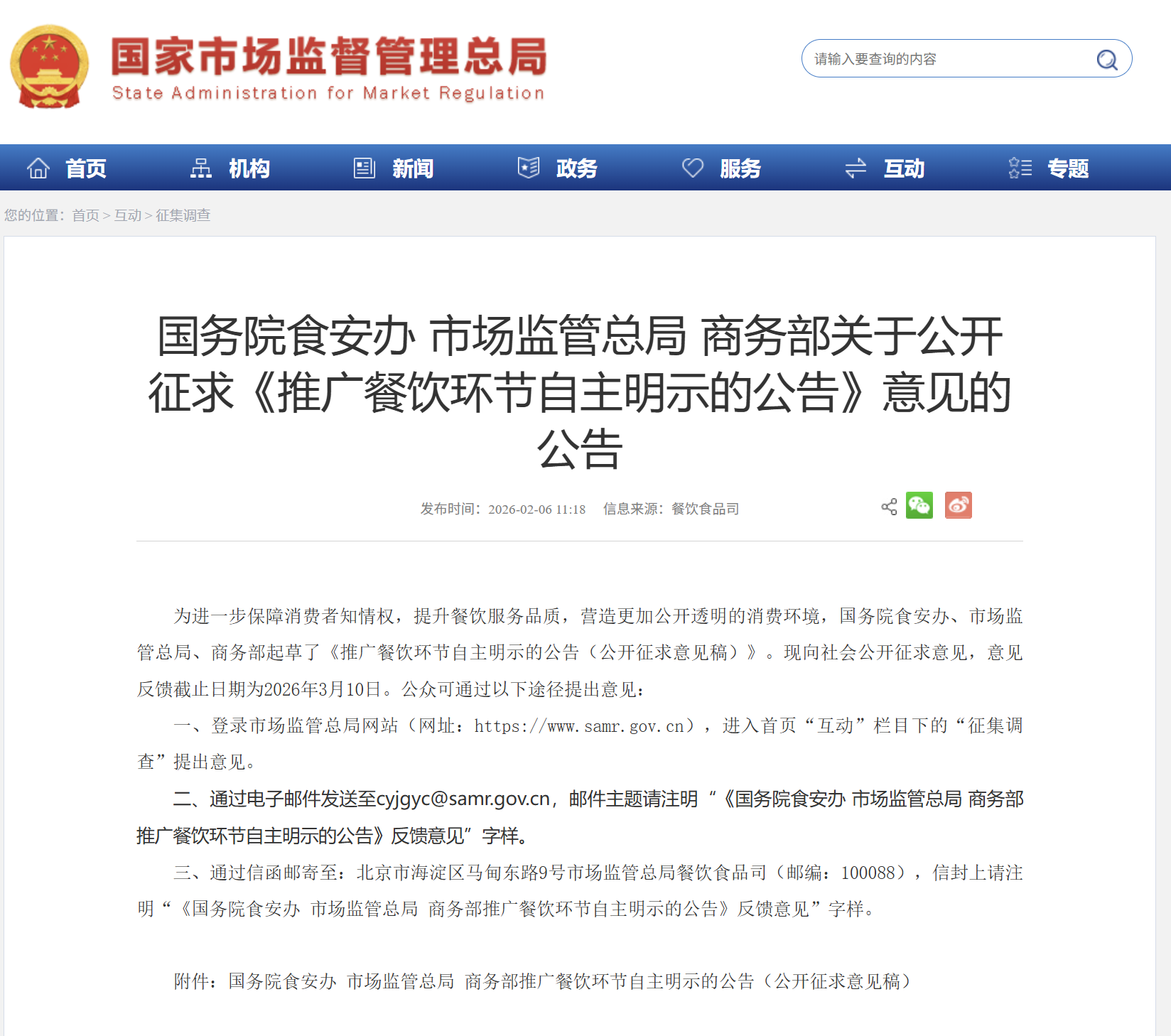 为进一步保障消费者知情权,提升餐饮服务品质,营造更加公开透明的消费环境,国务院食安办、市场监管总局、商务部起草了《推广餐饮环节自主明示的公告(公开征求意见稿)》。现向社会公开征求意见,意见反馈截止日期为2026年3月10日。公众可通过以下途径提出意见:
