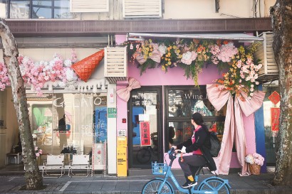 图为淡水路完成春日限定“换装”,变身花团锦簇的浪漫街区。