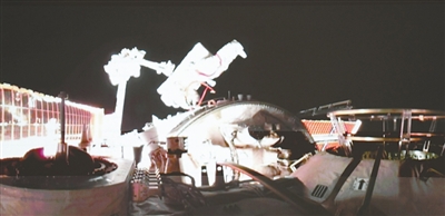 在北京航天飞行控制中心屏幕上拍摄的王杰出舱画面。 |