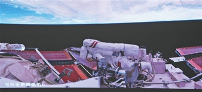 在北京航天飞行控制中心屏幕上拍摄的陈中瑞在空间站组合体舱外工作画面。 |